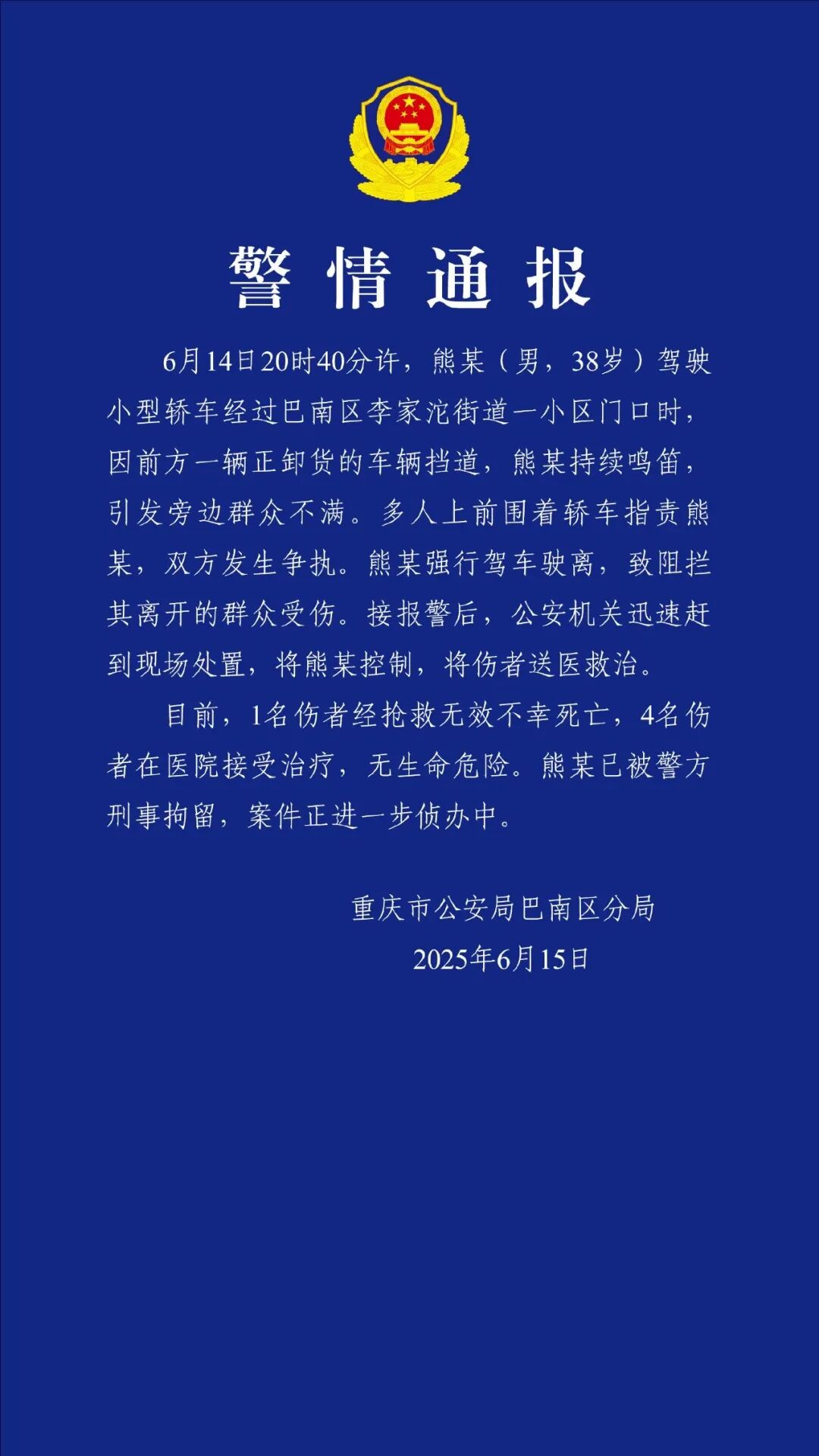 据通报,6月14日20时40分许,熊某(男,38岁)驾驶小型轿车经过巴南区李家沱街道一小区门口时,因前方一辆正卸货的车辆挡道,熊某持续鸣笛,引发旁边群众不满。多人上前围着轿车指责熊某,双方发生争执。熊某强行驾车驶离,致阻拦其离开的群众受伤。接报警后,公安机关迅速赶到现场处置,将熊某控制,将伤者送医救治。
