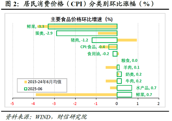 (二)内外因素共同推升工业消费品价格,非食品是CPI增速回升主因。6月份非食品价格同比增长0.1%,较上月提高0.1个百分点(见图1),国际大宗商品价格上涨以及以旧换新政策对工业消费品价格形成支撑是主要原因。具体看,一是受国际原油价格上涨影响,交通工具用燃料环比由下跌3.7%回升至上涨0.3%,同比降幅较上月收窄2.1个百分点,能源分项对CPI增速的下拉作用减弱0.08个百分点。二是受黄金价格进一步上涨影响,其他用品和服务价格同比涨幅较上月提高0.8个百分点,预计其对CPI增速的拉动较上月提高0.02个百分点。三是受益于以旧换新政策进一步显效以及电商大促销对需求的提振,6月份家用器具、交通工具价格同比分别较上月提高1.2和0.6个百分点,是本月CPI增速回升的主要贡献力量。四是服务价格环比增长0.0%,同比增长0.5%,均持平于上月,表现相对平稳(见图2-3)。