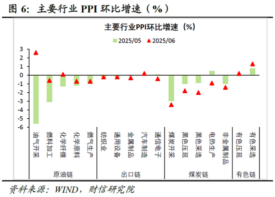 分行业看,煤炭、出口链拖累加深,但原油链、有色链价格环比有所回升,说明外部输入性下行压力有所减弱,但国内投资需求偏弱以及外部关税冲击影响显现,共同对PPI增速形成拖累。如受国际大宗商品价格回升影响,石油和天然气开采业、石油煤炭及其他燃料加工业、有色金属采选业等原油链、有色链行业价格环比增速普遍回升;但煤炭链、出口链行业价格环比增速则多数回落,尤其是黑色金属加工和压延业、非金属制品等建材行业价格回落较多,反映出国内投资需求不足尤其是房地产市场需求不足的拖累作用较大(见图6)。